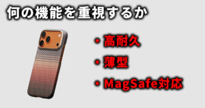 用途に応じて最適なケースは変わり、外出が多い方はMagSafe対応、ポケット派は薄型、アクセサリーを使いたい方はストラップホール付き、プレゼントならアラミド繊維・レザー系が最適です。