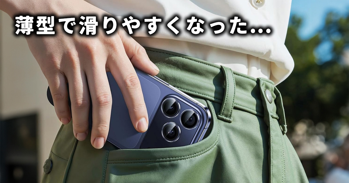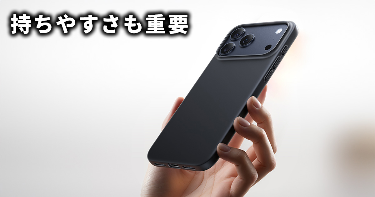 本体デザインが薄く滑らかになったことで、素の状態では「滑りやすい」「持ちにくい」と感じるユーザーが増えています。特に片手操作時や外出先では落下リスクが高まり、面取りされたエッジ形状も手から滑りやすい原因になります。