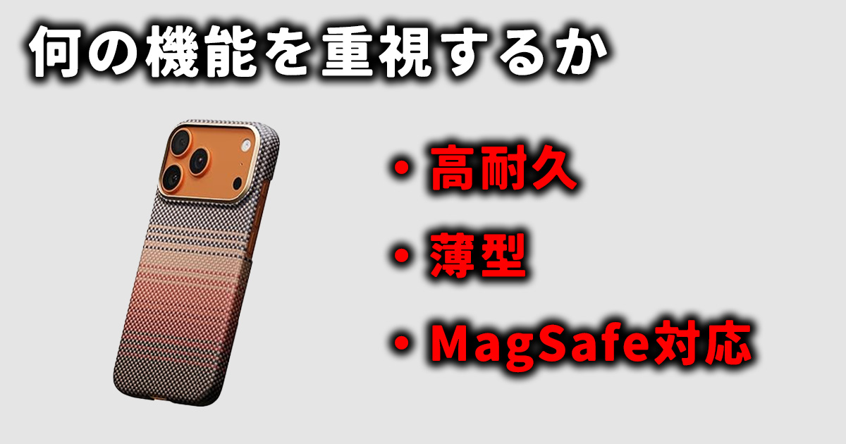 用途に応じて最適なケースは変わり、外出が多い方はMagSafe対応、ポケット派は薄型、アクセサリーを使いたい方はストラップホール付き、プレゼントならアラミド繊維・レザー系が最適です。