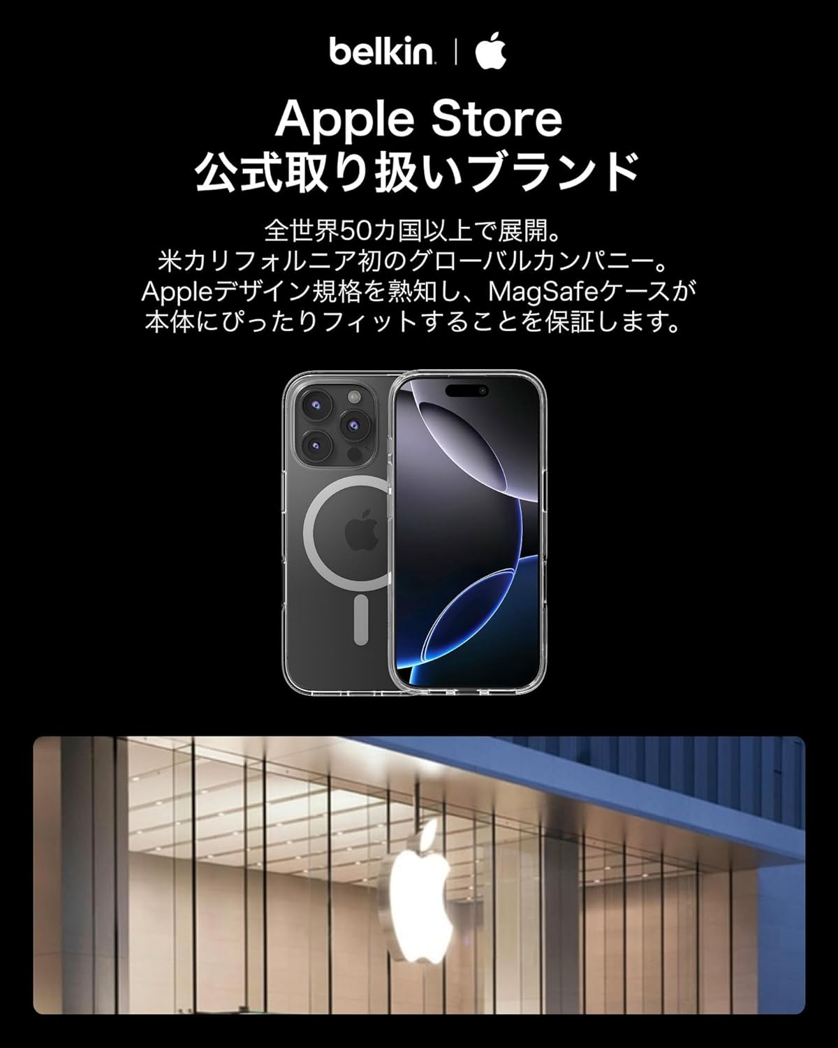 Belkin(ベルキン)はApple公式認定ブランドとして、高品質と信頼性で知られるアクセサリメーカーです。このiPhone Air対応クリアケースは、MagSafeおよびQi2(25W)充電に完全対応し、ケースを装着したままでも高速充電が可能。透明度の高いクリア素材がiPhone本来の美しさをそのまま際立たせます。