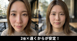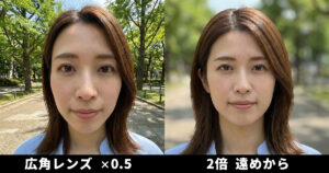 実際に撮り比べても、2倍の方が頬やあごの形が安定しやすく、印象が落ち着きます。距離を少し取ったうえで2倍にすると、さらにバランスが整いやすいです。
