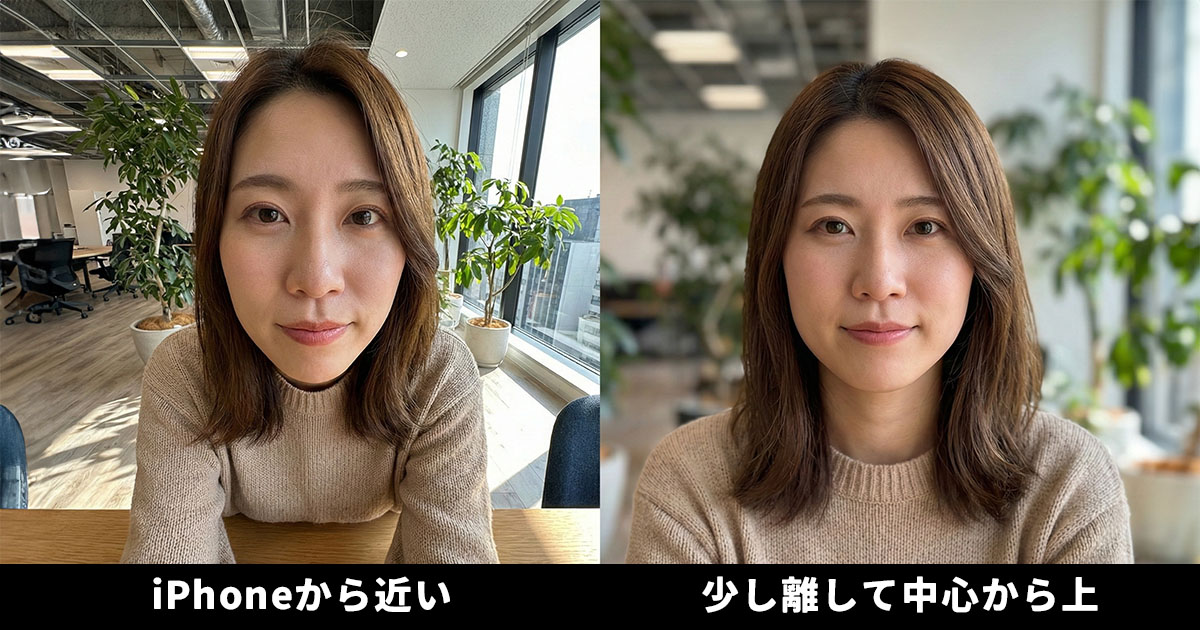 iPhoneのノーマルカメラで顔が不自然に見える大きな原因は、カメラとの距離が近すぎることです。実際に撮り比べてみると、腕を伸ばして少し距離を離すだけで、鼻や頬の強調が弱まり、全体のバランスが整いました。顔の中心だけが大きく写る現象が軽減されるため、印象が落ち着いて見えます。