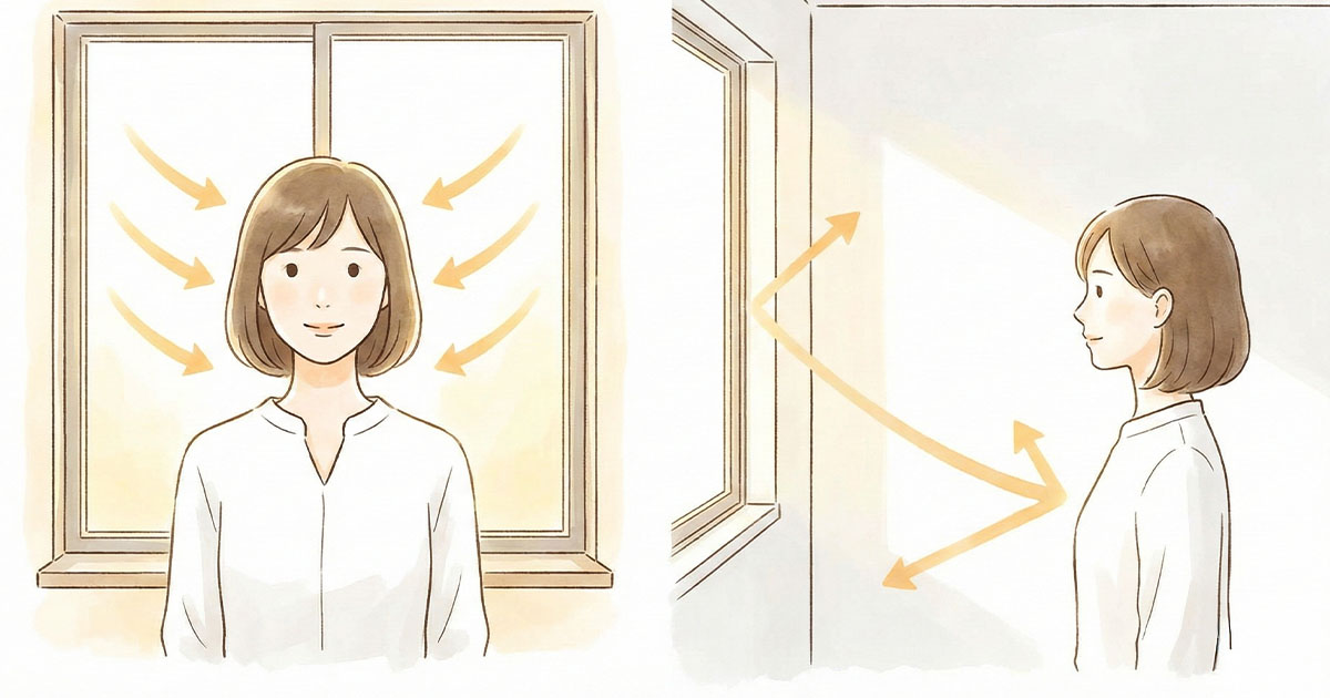 窓の近くで外の光を正面から受ける位置に立つだけでも印象は変わります。室内では白い壁に向かって立つと光が反射し、自然で明るい仕上がりになりやすいです。
