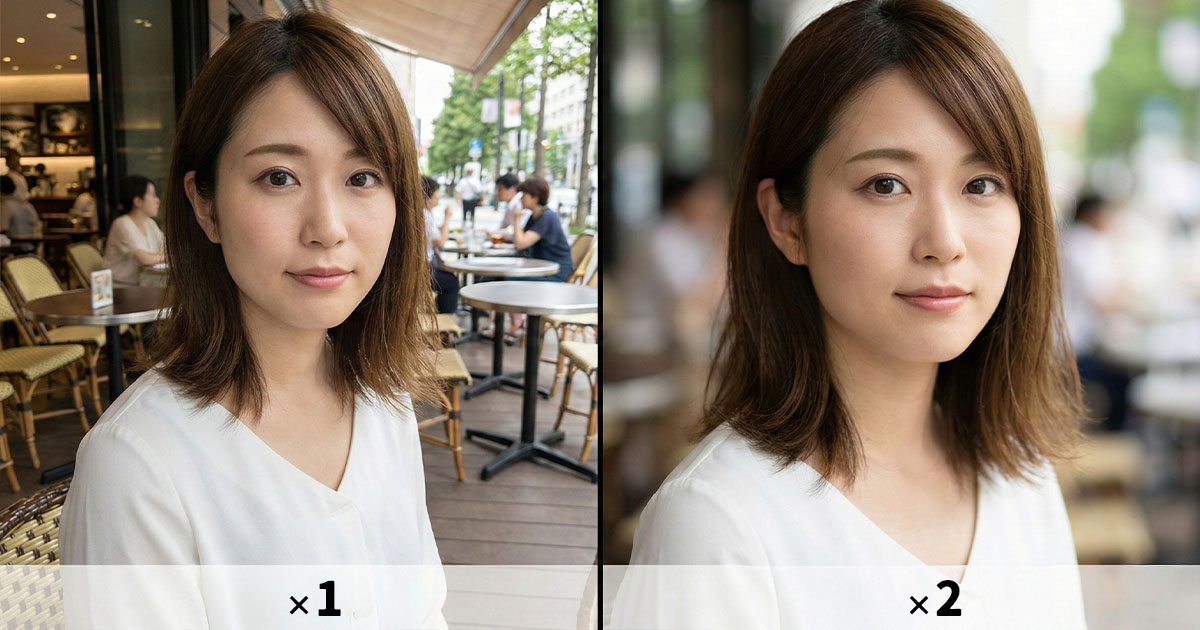 実際に比較すると、2倍では頬やあごのラインが引き締まって写りやすく、全体のバランスが安定します。画質が落ちるというより、写り方の違いによって印象が変わるというのがポイントです。