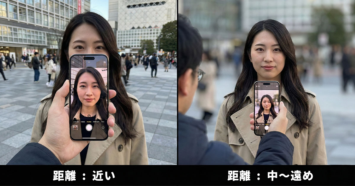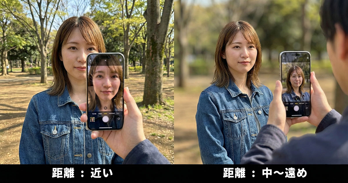 距離が近いと、手前のパーツが強調されやすくなりますが、離すことで顔全体が均等に写りやすくなります。画質の問題ではなく、撮影距離によって見え方が変わっていることが分かります。