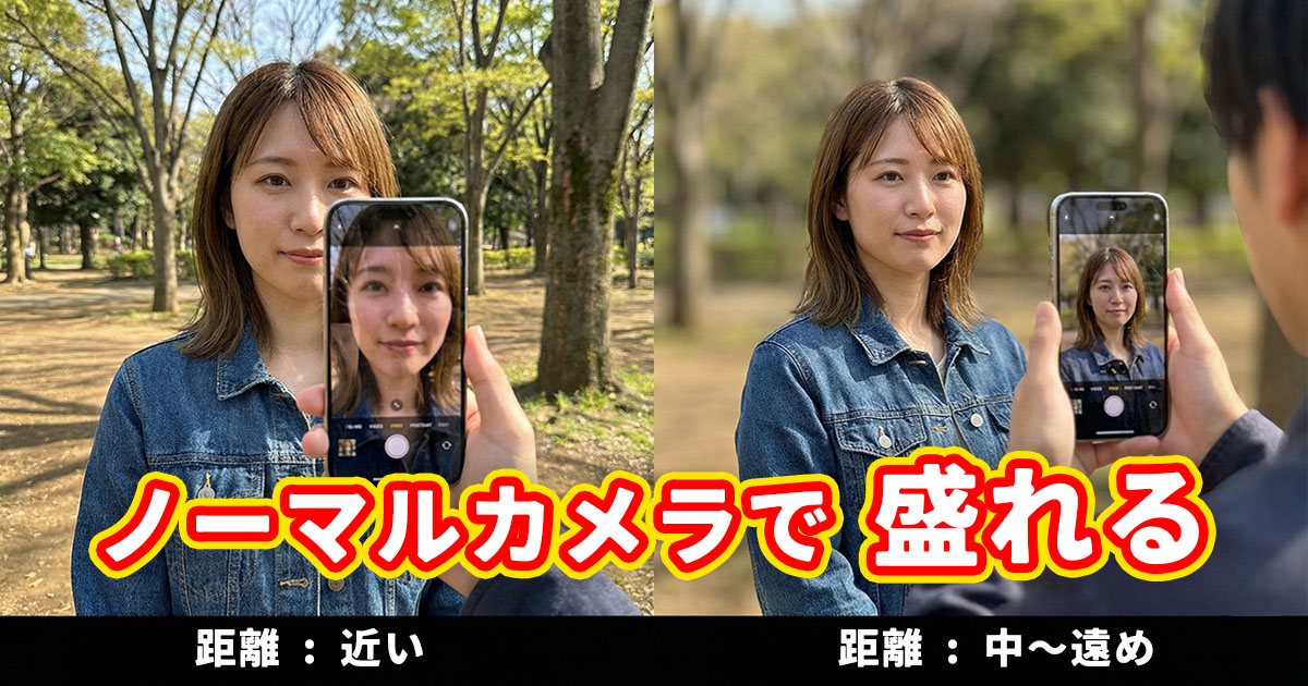 iPhoneのノーマルカメラは「盛れない」のではなく、広角レンズの特性や撮影距離によって印象が変わるだけです。顔を近づけすぎると歪みが強くなりやすいですが、40〜60cm離す、2倍ズームを使う、正面から光を当てるといった工夫で写りは大きく改善しました。