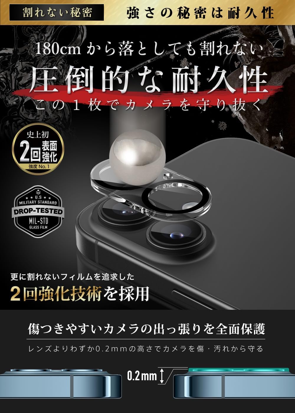 ESRの「Armoriteシリーズ」は、米軍MIL規格に準拠した耐衝撃性能を誇るカメラ保護フィルムです。独自の「凹型」構造が衝撃を分散し、割れにくさを従来比80%向上。