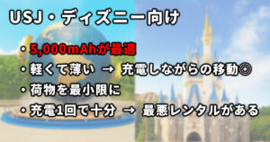 もし足りなくなっても、パーク内にはレンタルモバイルバッテリー(ChargeSPOT)が豊富に設置されているため、無理に大容量を持つ必要はありません。軽さ・薄さを最優先に選ぶのがおすすめです。