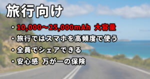 旅行、とくに家族旅行や海外旅行では「安心感」が最も重要。移動時間が長く、写真・動画撮影も増えるため、10,000〜25,000mAhの大容量モデルが最適です。複数台同時充電できるタイプなら、家族のスマホやタブレットもまとめてカバーできます。