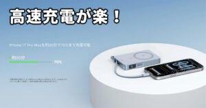 急速充電性能も非常に高く、スマートフォンはもちろん、iPadや一部ノートPC(MacBook Airなど)まで充電できる実用性があり、ビジネス用途でも強力に活躍。ケーブル内蔵+高出力+軽量薄型という三拍子がそろった万能モデルで、iPhone17 Proを含むUSB-Cデバイスとの相性は抜群。旅行・通勤・ビジネスにまで幅広く使える完成度の高い1台です。