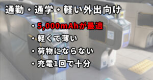 USJやディズニーなどのテーマパークでは、なるべく手荷物を軽くすることが最優先。5,000mAh前後の薄型モデルなら撮影・待ち時間のSNS更新にも対応でき、ストレスなく持ち歩けます。