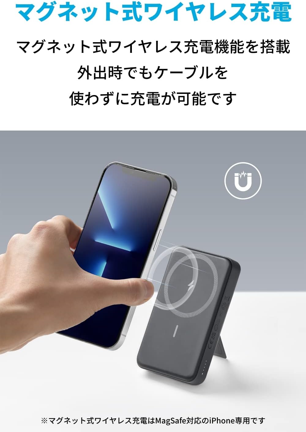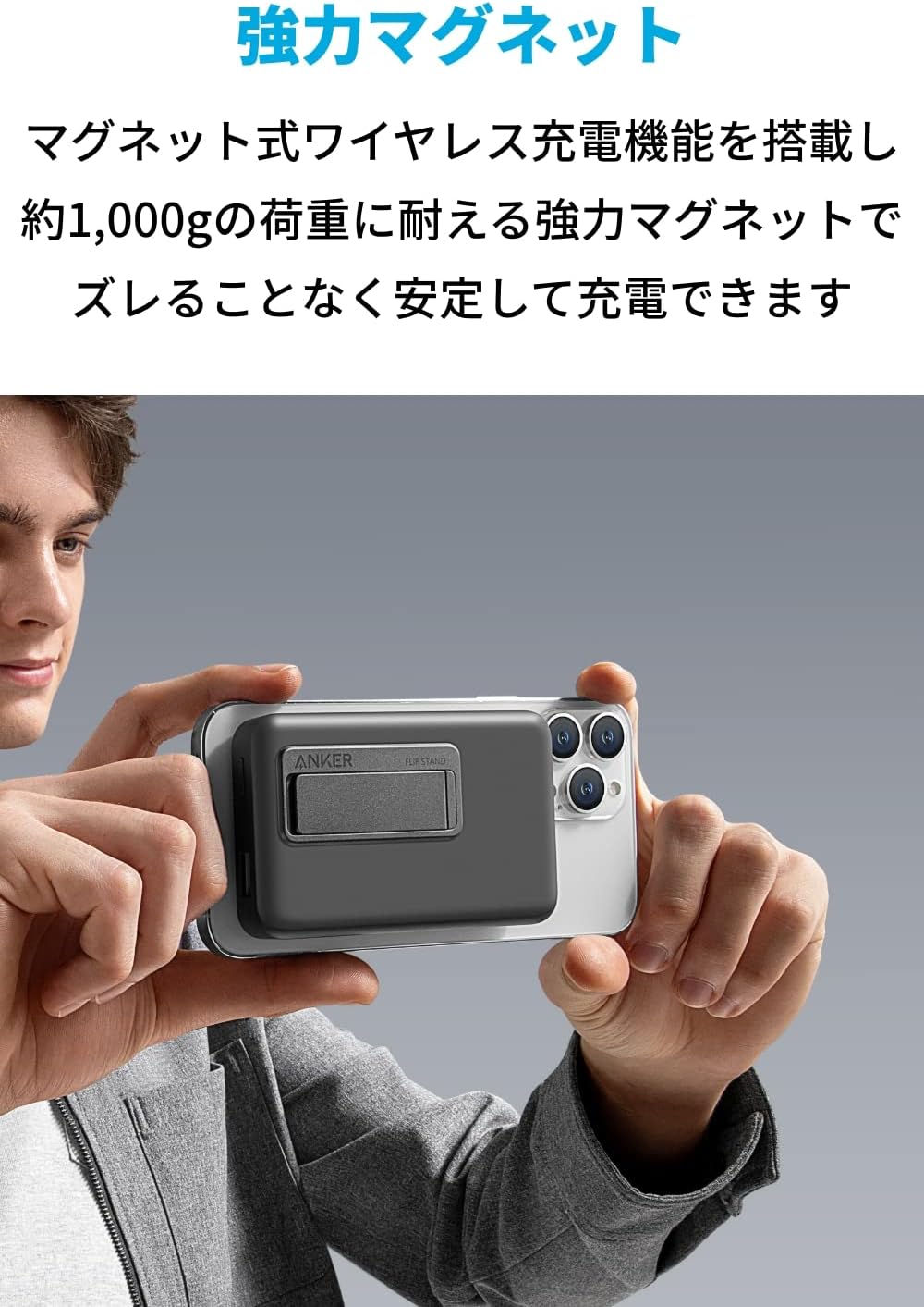 ケーブルを使わずに貼り付けるだけで充電できるため、移動中や撮影中でもストレスなく使えます。Anker独自のWireless PowerIQとActiveShield 2.0により発熱を抑えつつ高速充電を実現し、USB-C経由での20W急速充電にも対応。ポケットに入れてもかさばらないスリム設計で、外出や旅行、テーマパークでの長時間利用にも最適な1台です。