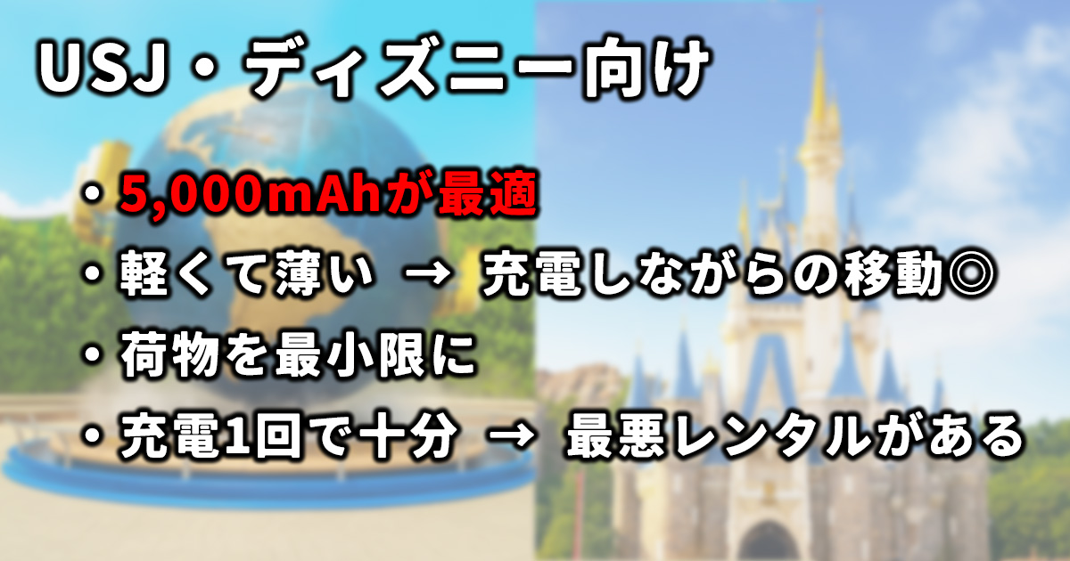 もし足りなくなっても、パーク内にはレンタルモバイルバッテリー(ChargeSPOT)が豊富に設置されているため、無理に大容量を持つ必要はありません。軽さ・薄さを最優先に選ぶのがおすすめです。