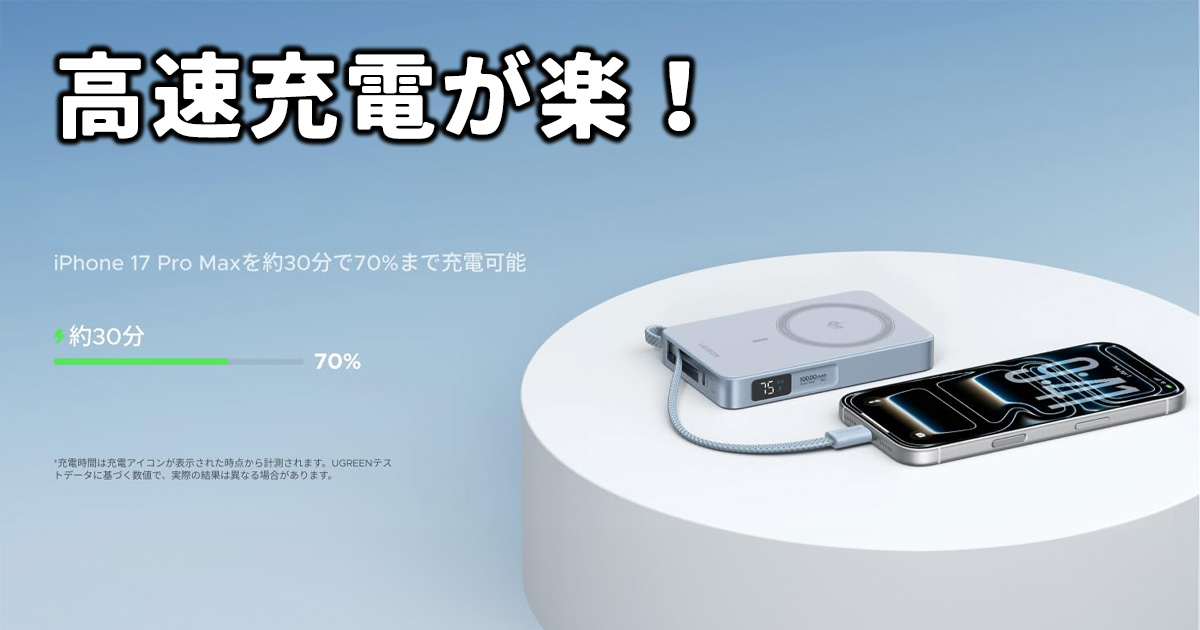 急速充電性能も非常に高く、スマートフォンはもちろん、iPadや一部ノートPC(MacBook Airなど)まで充電できる実用性があり、ビジネス用途でも強力に活躍。ケーブル内蔵+高出力+軽量薄型という三拍子がそろった万能モデルで、iPhone17 Proを含むUSB-Cデバイスとの相性は抜群。旅行・通勤・ビジネスにまで幅広く使える完成度の高い1台です。