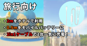 旅行では「2mの通常ケーブル」と「0.5mの短いケーブル」の2種類を使い分けるのが最適です。ホテルではコンセントの位置が遠いことも多く、2mがあると非常に便利。一方、移動中やモバイルバッテリー利用時は0.5mがかさばらず快適に使えます。