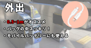 外出や通勤では荷物を最小限にしたいので、0.5m〜1mの短めケーブルが最適です。バッグの中で絡まりにくく、モバイルバッテリーと一緒に使っても邪魔にならない長さで、ストレスなく持ち運べます。