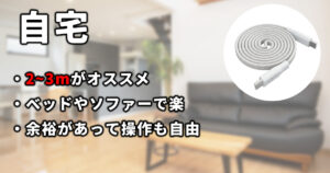 自宅で使うなら、取り回しやすく断線にも強い高耐久タイプで、長さは2m〜3mが最適です。ソファやベッド周りなど、離れた場所から充電しながら操作する場面が多く、多少ケーブルが長くても邪魔になりにくいのが自宅利用のメリットです。