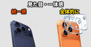 一方、黒縁なしはカバーを貼っていることが分かりにくく、iPhone本来のデザインを損ねにくいのが特徴です。カメラユニットの主張を抑えたい人や、クリアケース・薄型ケースを使う人には相性が良い選択肢と言えます。見た目を取るか、自然さを取るかで好みが分かれます。