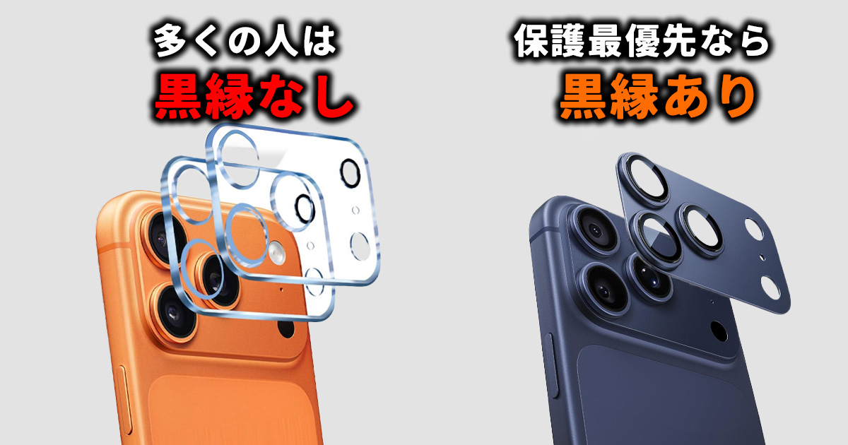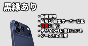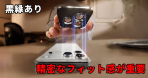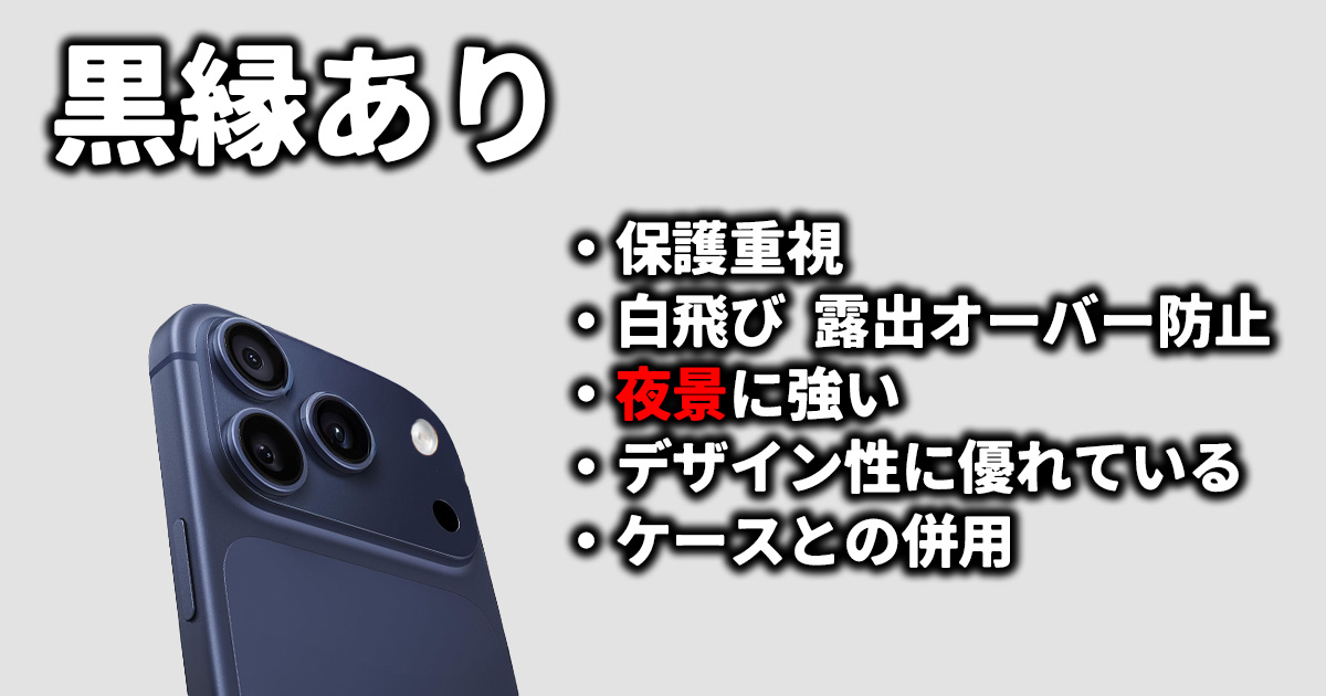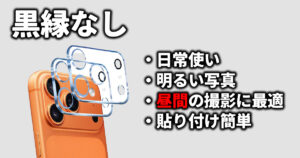 一方で、黒縁ありはレンズ周囲を覆う構造上、物理的な保護性能を重視したい人向けの選択肢です。落下や擦り傷対策を最優先する場合には有効ですが、製品の品質や設計精度によっては画質に影響が出る点には注意が必要です。