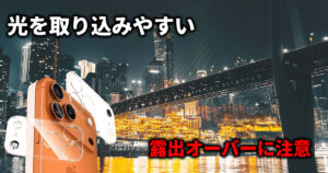 夜景や室内照明で「明るく写りすぎる」と感じる人は、露出設定だけでなくカバーの相性も疑う価値があります。貼り替えで改善する例も多いので、選定は慎重に。詳しくは別記事の「露出オーバー対策」とも接続できます。