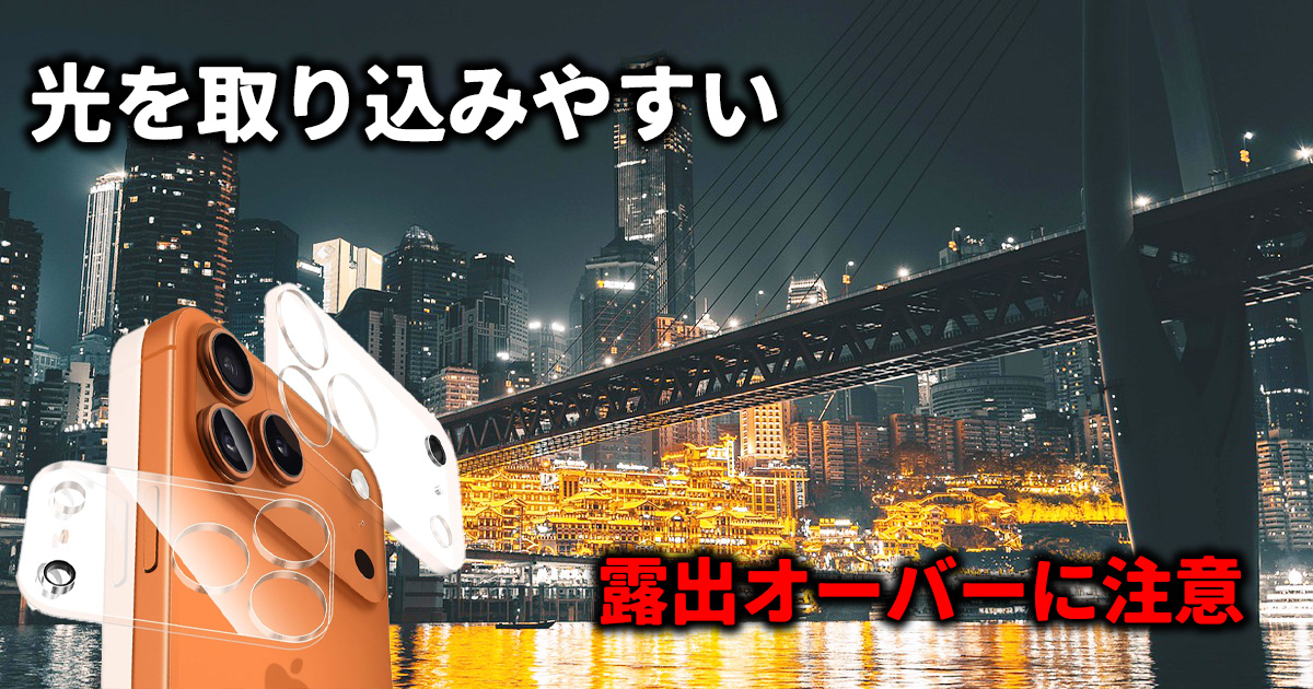 透明(黒縁なし)カメラカバーを使えば必ず白飛びしない、というわけではありません。白飛びが起きるかどうかは、ガラスの透過率や反射防止処理、表面の汚れや指紋など複数の要因が関係します。低品質な透明カバーでは、逆光や夜景で白っぽく写ることもあります。