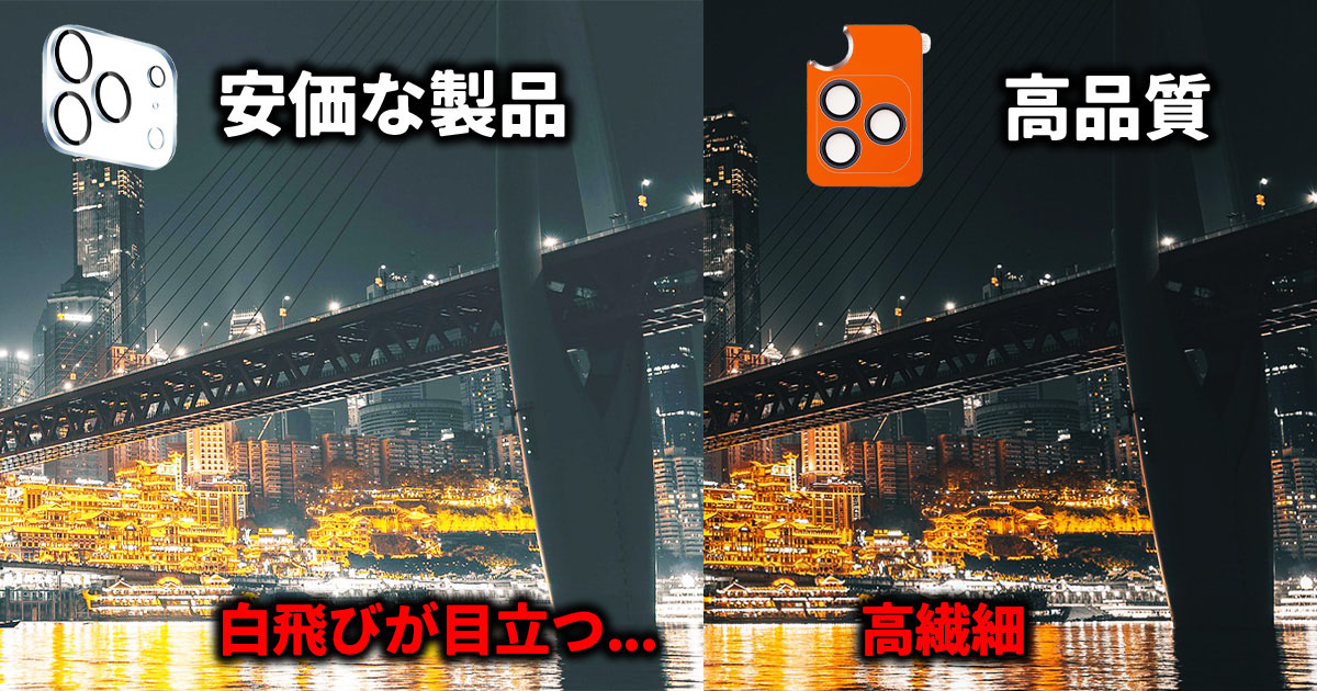 カメラ保護カバーは、貼ることで画質が落ちてしまっては意味がありません。安価な製品では、透過率が低かったり、反射対策が不十分なものもあり、写真が白っぽくなったり、夜景でにじみが出る原因になります。特に逆光やフラッシュ使用時は差が出やすいポイントです。