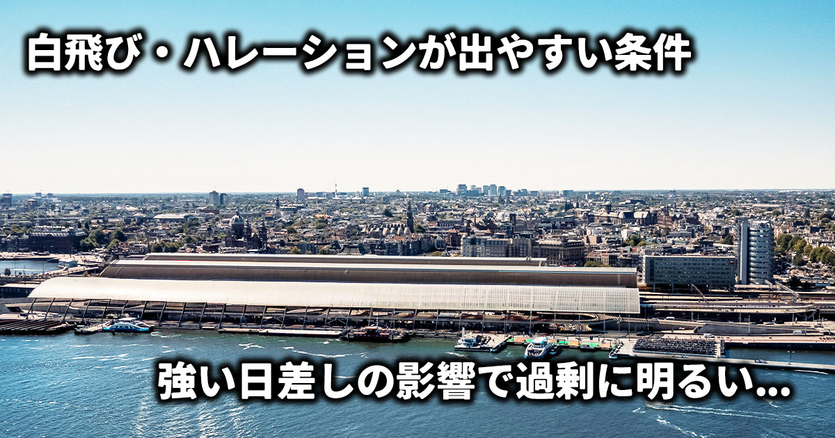 白飛びやハレーションは、光が強い環境ほど発生しやすくなります。まず強い日差しの屋外では、太陽光がフィルム面で反射し、明るさが過剰に見えることがあります。