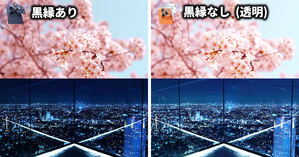 カメラ保護カバー選びで意外と迷いやすいのが「黒縁あり・なし」の違いです。黒縁タイプはレンズ周りの反射を抑えやすく、白飛びやフレアが出にくい傾向があります。一方、縁なしタイプは見た目がスッキリしますが、光の入り方によっては写りに影響が出るケースもあります。