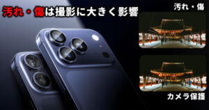 最初は「気のせいかな」と感じる程度でも、比較すると明らかに解像感が落ちていることもあります。iPhone17 Proの高性能カメラを最大限活かすためには、レンズを常にクリアな状態に保つことが重要で、保護なし使用は画質劣化のリスクを抱えたまま使うことになります。
