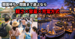 開園待ちから閉園まで遊ぶなら、軽さ・容量・充電方式のバランスを事前に決めておくことが重要です。当日になってから「足りない」「重い」「使いにくい」と気づいても、どうにもなりません。
