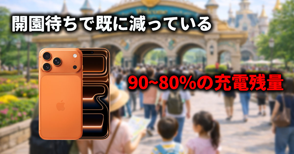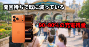 ディズニーでは、入園前の開園待ちの時点でiPhoneのバッテリーを想像以上に消耗しています。待ち時間中にSNSを見たり、当日のスケジュールを確認したりするだけで、画面点灯時間が長くなりがちだからです。