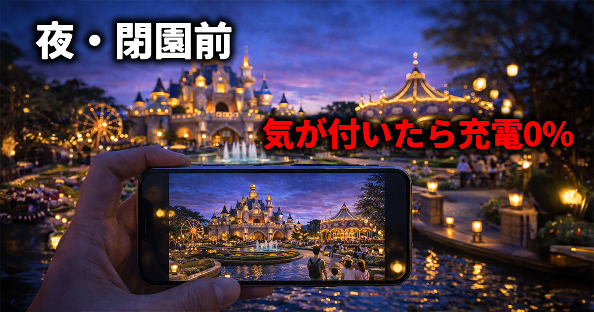 夜から閉園前にかけては、iPhoneの残量が最も重要になる時間帯です。写真や動画の撮影が増え、マップ確認や帰宅ルートの検索など、バッテリーを使う場面が集中します。