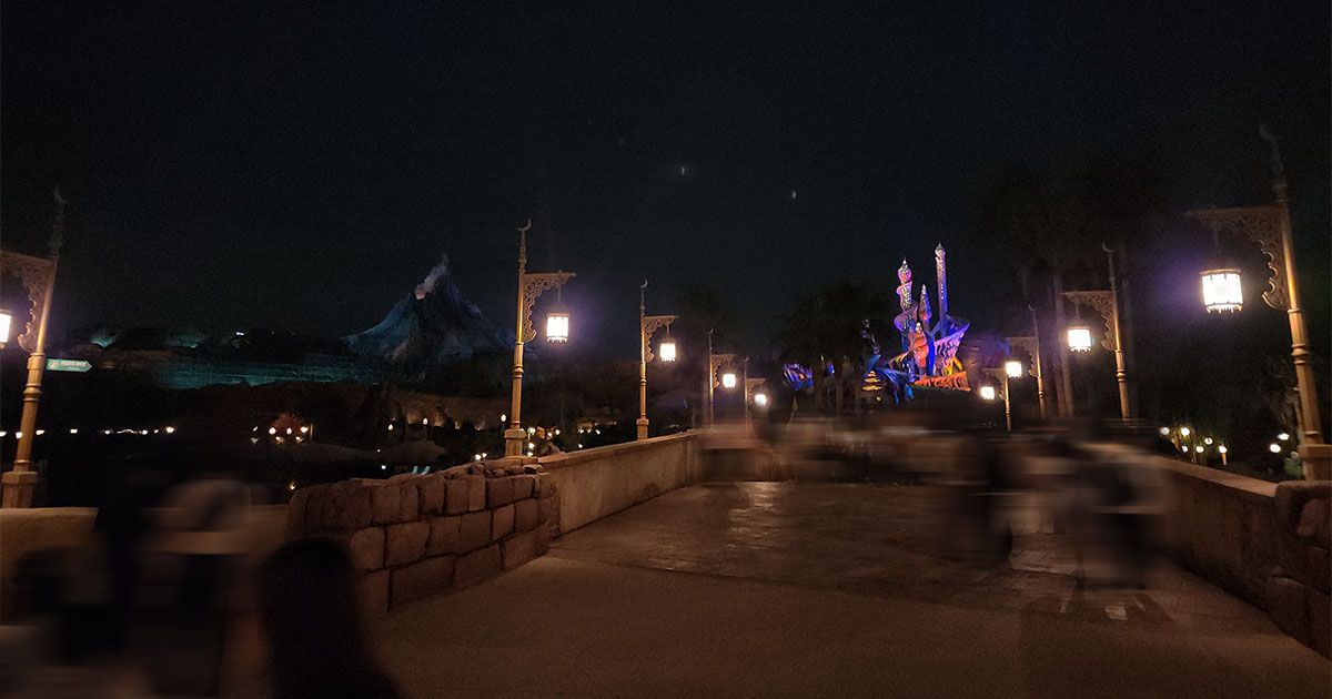 ディズニーシーの貸切イベント中のディズニーシーは、普段の夜とは別世界のように歩きやすくなります。メディテレーニアンハーバーからアラビアンコースト、ロストリバーデルタ方面まで、人気エリアでも人が密集する場面がほぼありませんでした。特に橋などの通路が空いているため、写真撮影がしやすく、カップルや家族も立ち止まってゆっくり景色を楽しめます。