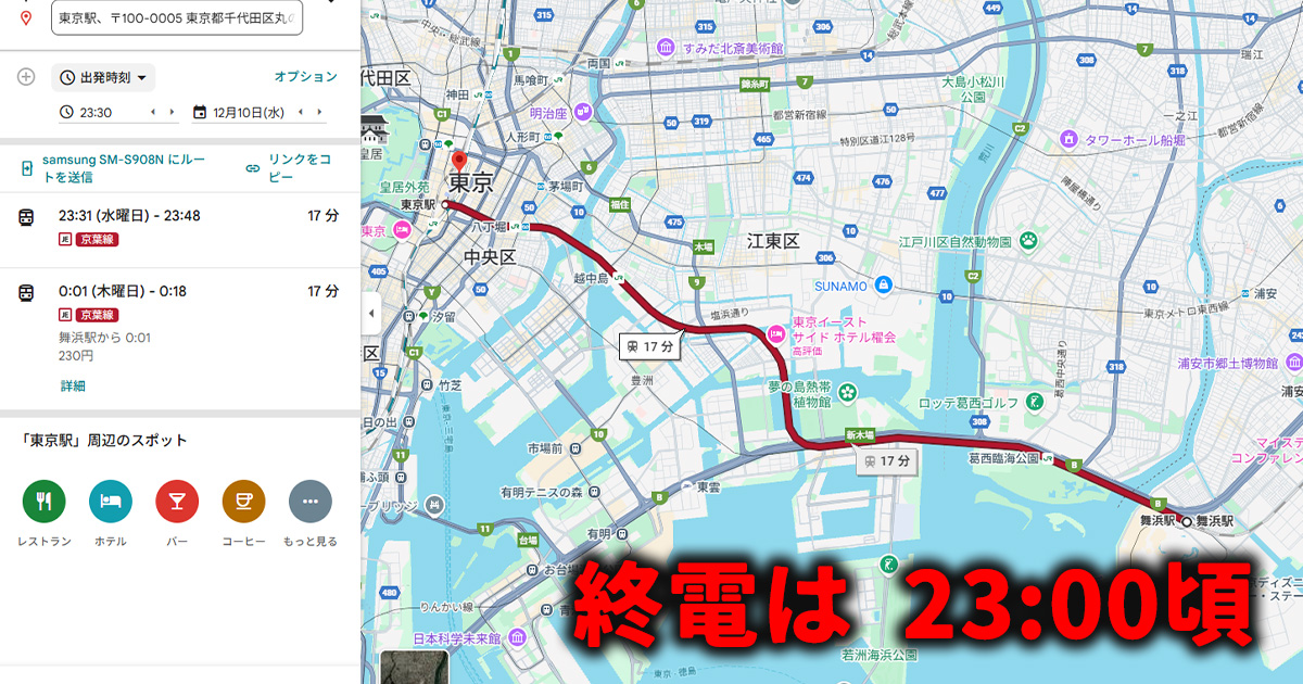 舞浜駅から東京方面の終電はおおむね23時30分前後が目安です(時期により多少変動)。閉園後は混雑しやすいため、パレードや花火を最後まで見る場合は帰りのルートを事前に確認しておくのが安心。東京駅・八丁堀・新木場方面への終電を把握しておくとスムーズに移動できます。
