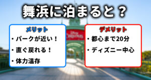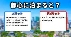 一方で、東京観光を組み合わせる場合は都心への移動が長くなり、スカイツリーや浅草、銀座などの定番スポットへ行きづらい点がデメリット。ホテル料金もやや高めになりやすいため、滞在スタイルが“ディズニー中心かどうか”で判断するのが最適です。