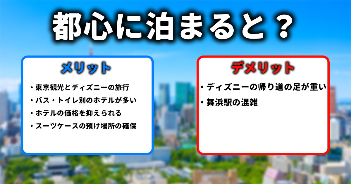 デメリットは、ディズニー閉園後の帰路が混雑しやすく、時間帯によっては乗換が必要になる点。また早朝のパーク到着を重視する場合は舞浜より不利になるため、“東京観光とディズニーをどちらに比重を置くか”で選ぶのがポイントです。