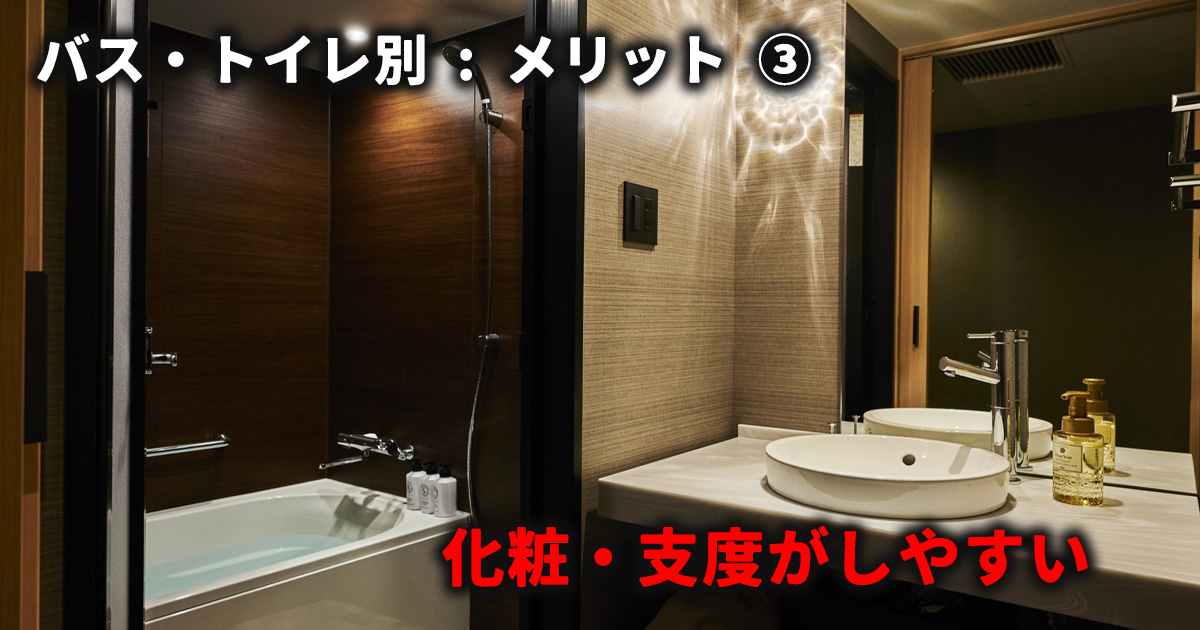 バス・トイレ別は、カップル旅行で最も評価されるポイントの一つです。特にディズニーや東京観光のように朝が早く夜が遅くなる旅では、支度のタイミングが重なりやすく、同時利用できるかどうかが快適性を大きく左右します。