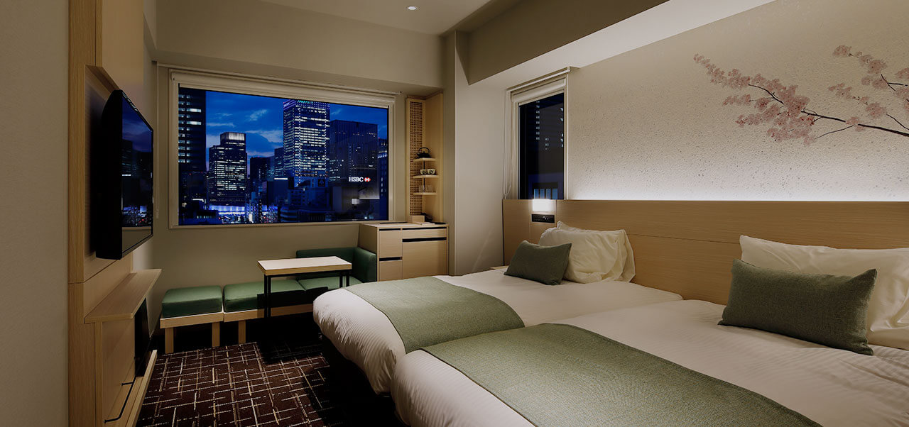 東京駅八重洲通り徒歩12分、八丁堀駅徒歩3分、宝町駅徒歩8分。 全室が禁煙、バス・トイレ・洗面台3点独立型、和にこだわった上質な空間でホテル滞在を。ホテル最上階にあるフロントと日本酒Barでは、日本庭園越しに東京の高層ビル街の景色をお楽しみいただけます。