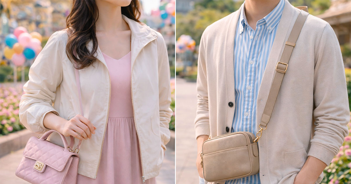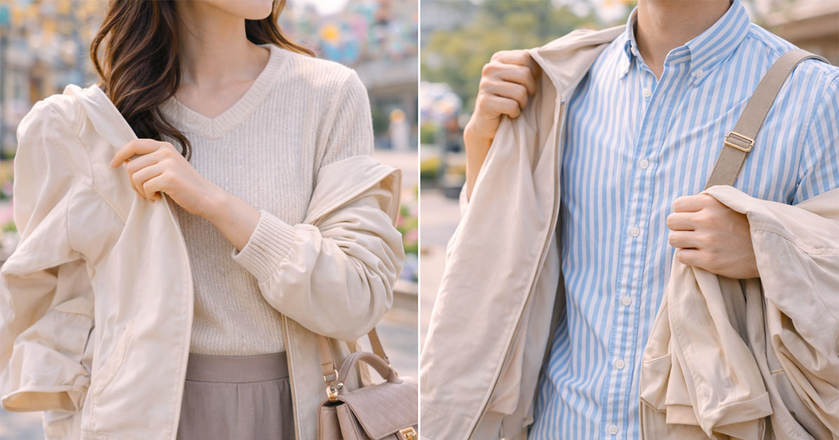 春ディズニーは日中こそ暖かく感じますが、朝と夜は海風や日陰の影響で想像以上に冷えます。特に閉園時間まで滞在する場合、防寒対策をしていないと体力を消耗しやすくなります。おすすめは、さっと羽織れる薄手アウターやパーカー、カーディガンです。厚手すぎないものを選べば、日中はバッグに入れても邪魔になりません。
