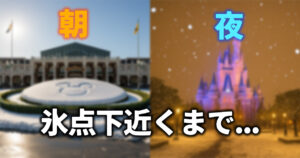 冬のディズニーリゾートは、日中の穏やかな陽気から一転して朝晩は氷点下近くまで冷え込みます。特に海沿いに位置するため、風が強く体感温度が一気に下がるのが特徴です。風が吹く日には、気温以上に寒さを感じやすく、手や耳などの末端が冷えやすくなります。