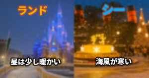 冬のディズニーでは、同じ舞浜エリアでも「ランド」と「シー」で寒さの感じ方が大きく異なります。シーは海に面しているため、海風が直接吹きつけ、体感温度が2〜3度低くなることも珍しくありません。